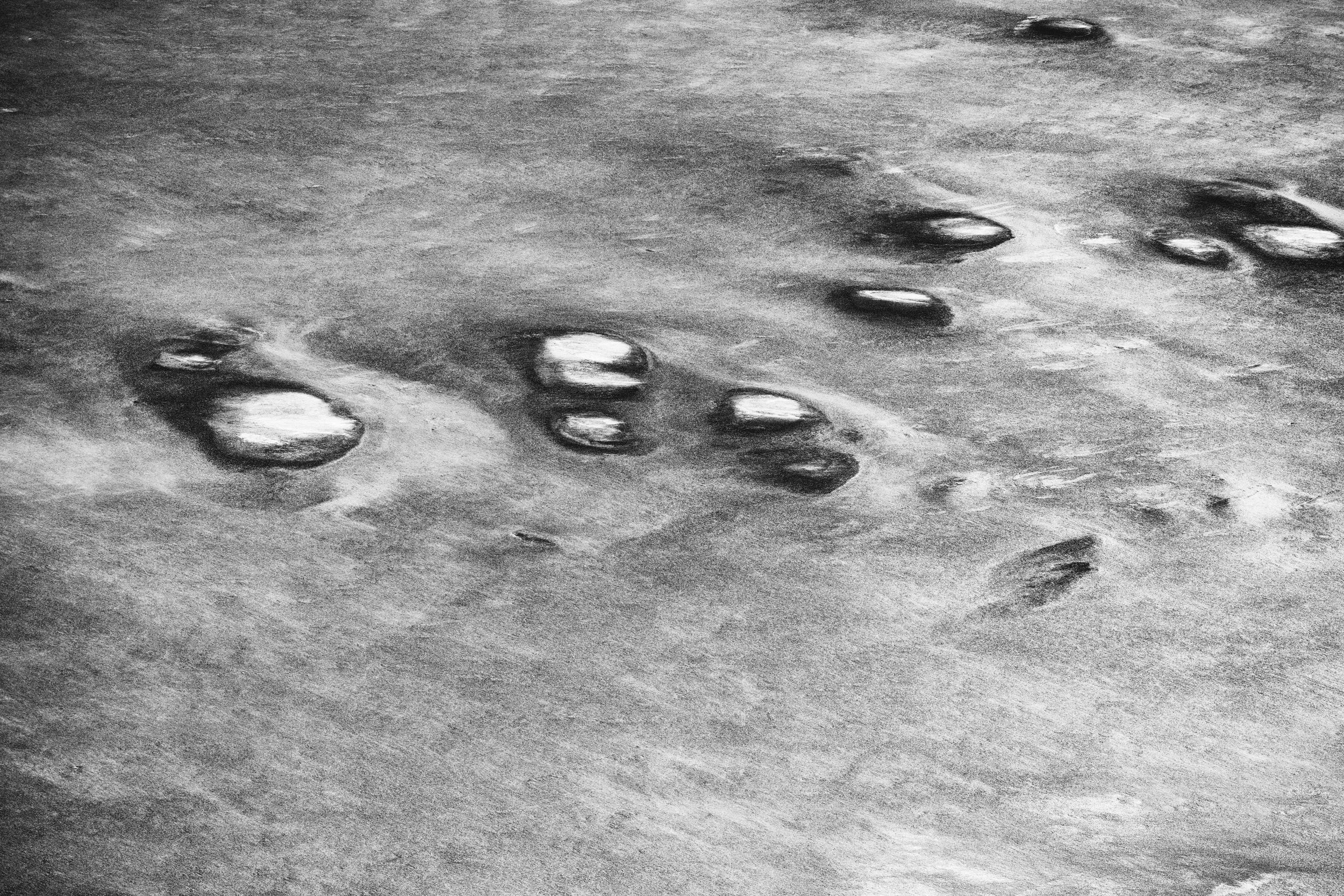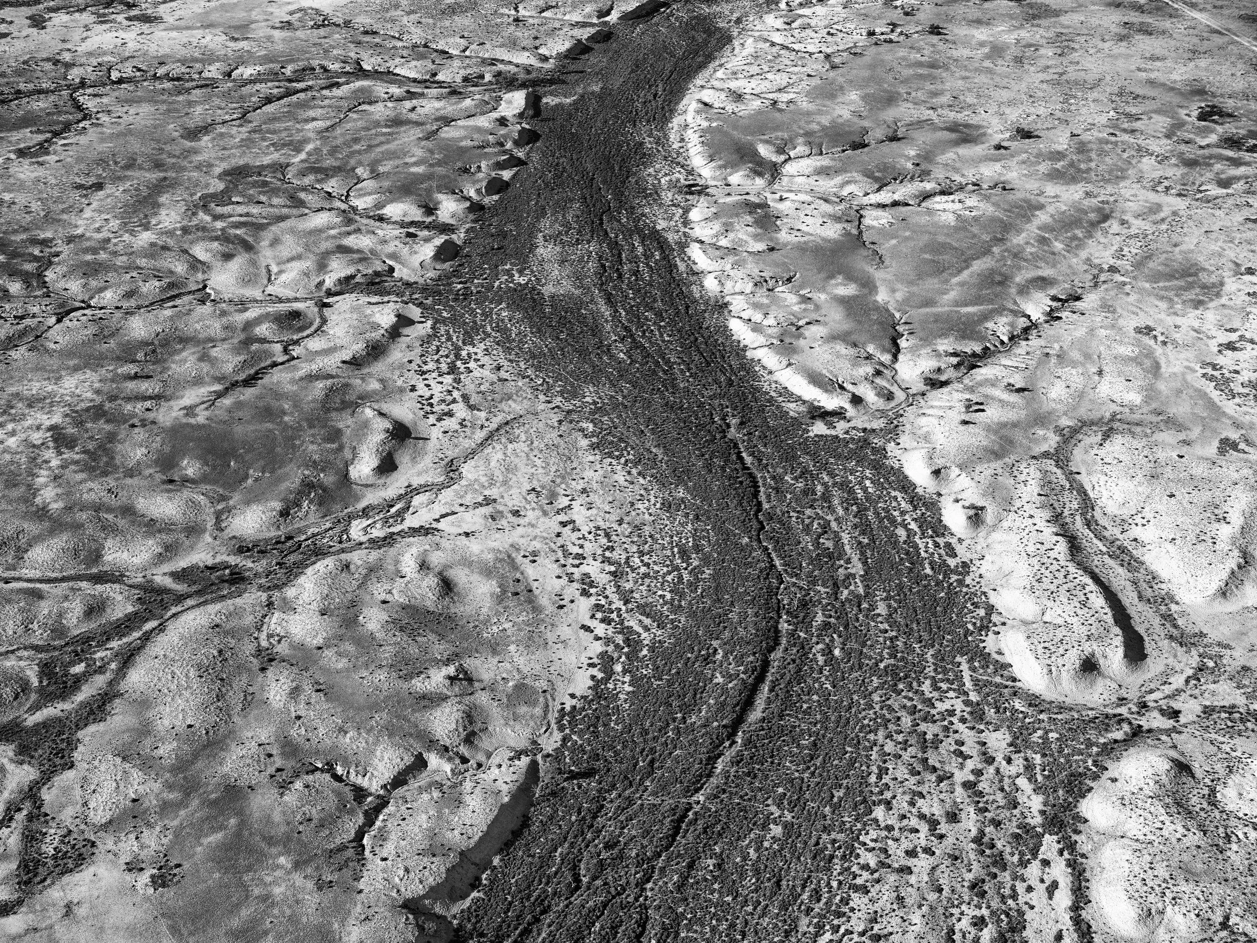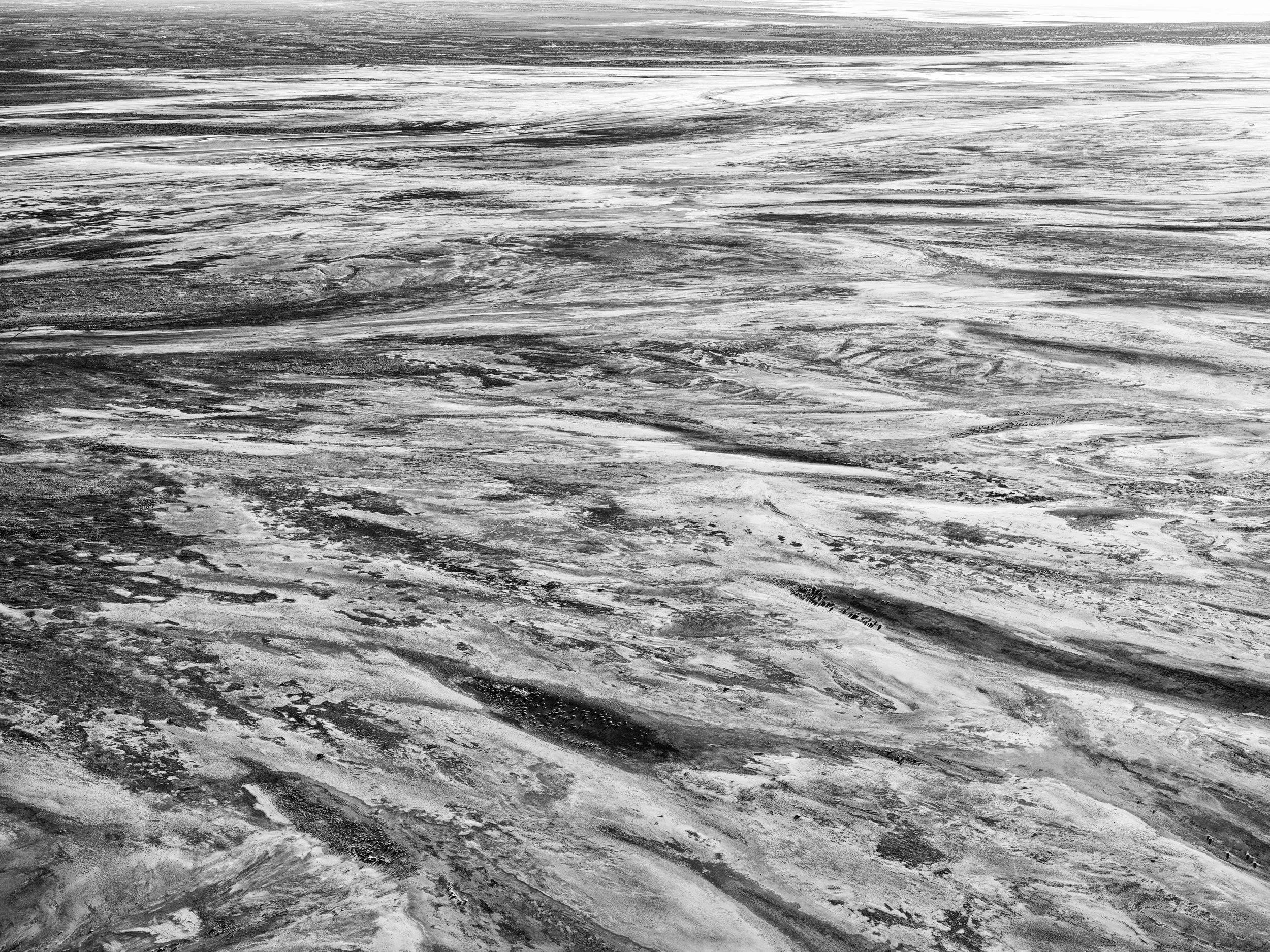 Delicate white streaks flowing like veins across the dark, textured surface. This ephemeral landscape speaks to the transient yet timeless nature of the desert and its rare floods, etched in striking contrasts of light and shadow.
