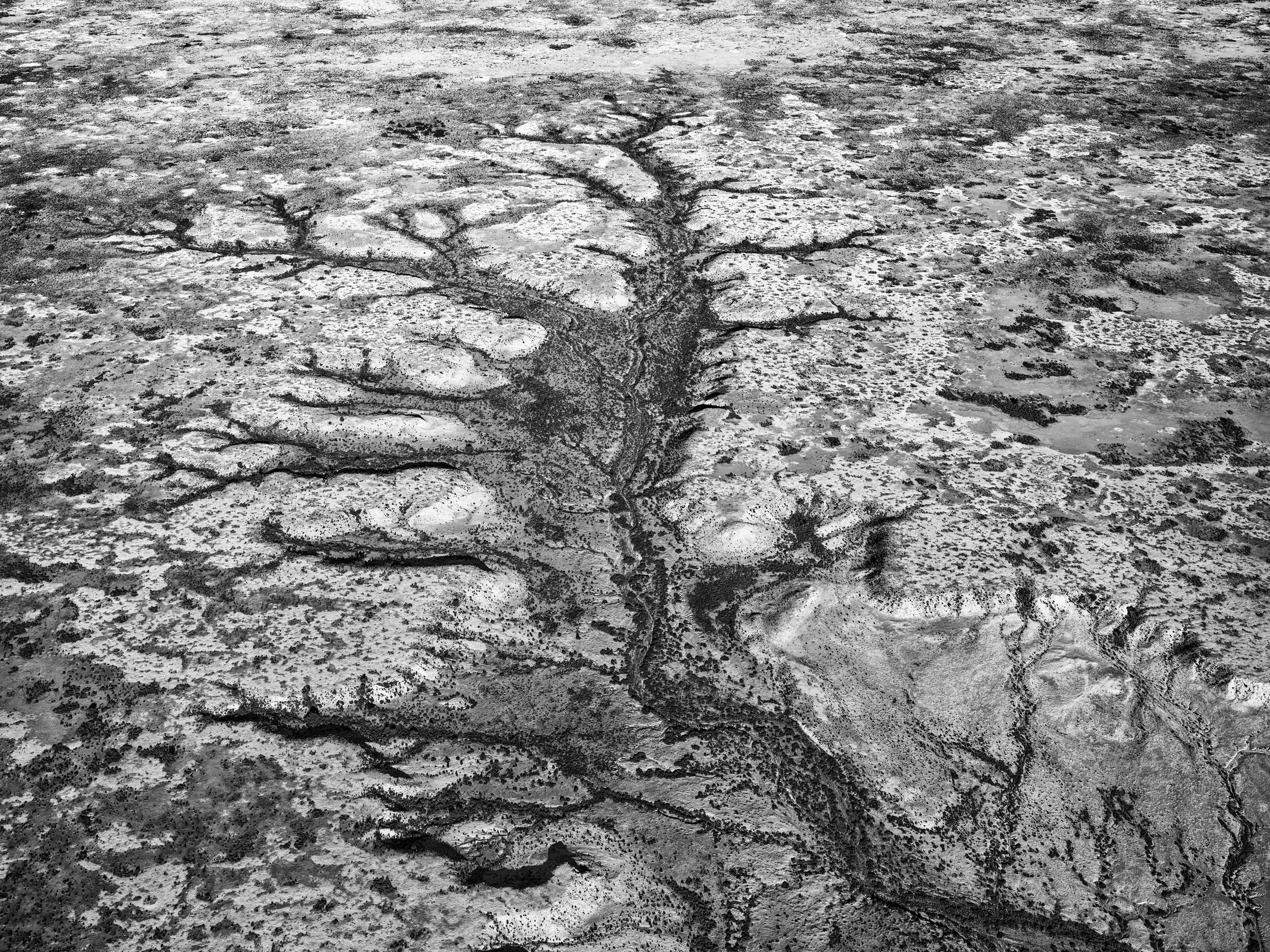 Water channels create organic line work across the landscape, resembling abstract calligraphy on a vast canvas.